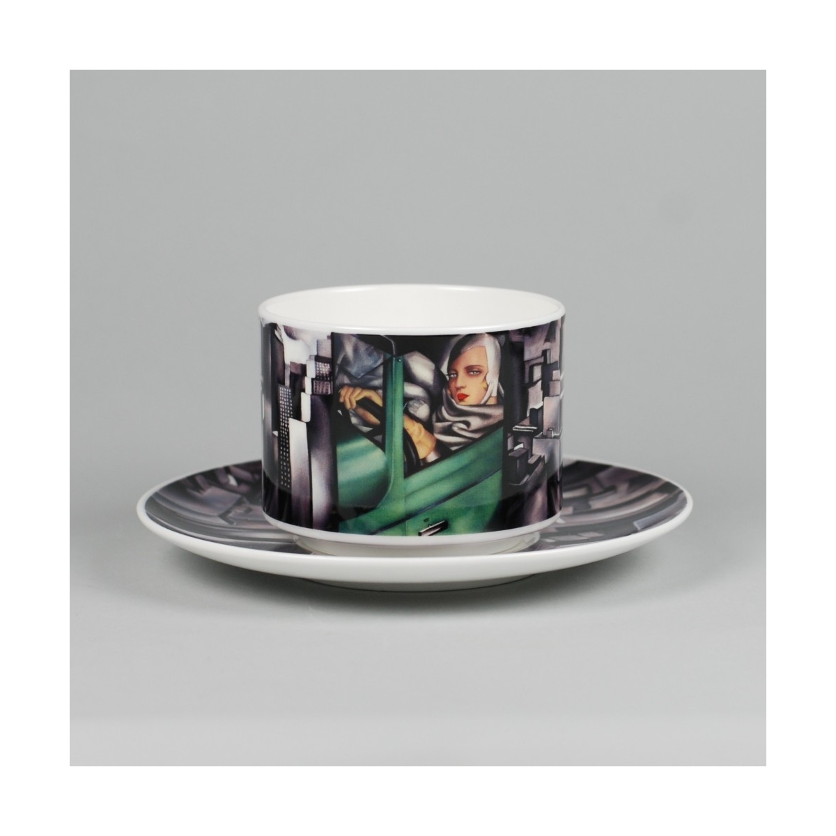 Filiżanka Amelia z dekoracją „Autoportret (w Zielonym Bugatti)” to wyrazisty akcent na stole: klasyczna forma, dopracowane tło obrazu oraz spójna grafika również na spodku.