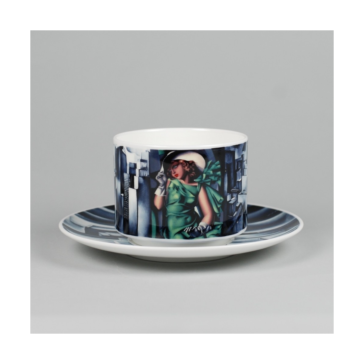 Filiżanka Amelia z dekoracją „Dziewczyna w Zielonej Sukience” to wyrazista porcelana z klimatem art déco: elegancka forma, dopracowane tło obrazu i spójna grafika również na spodku.
