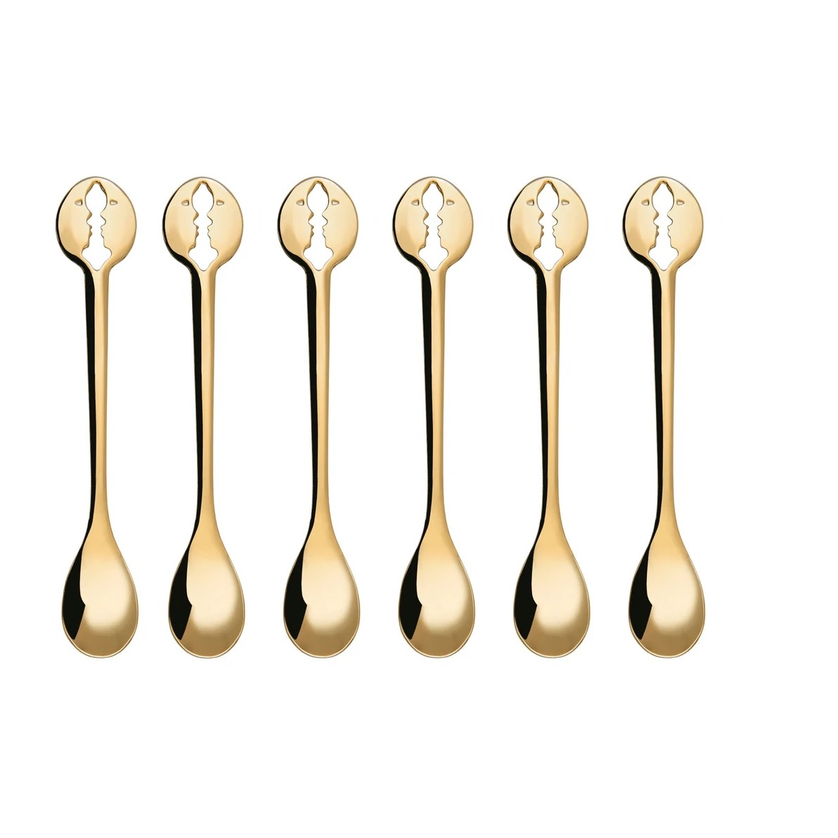 Kiss - Pocałunek od Casa Bugatti łyżeczki do espresso w kształcie twarzy zbliżających się do pocałunku. Kolekcja Kiss zaprojektowana przez Teseo Berghellę to romantyczna ikona z symbolem miłości. Łyżeczki wykonane z najwyższej jakości stali nierdzewnej platerowane 24-karatowym złotem.