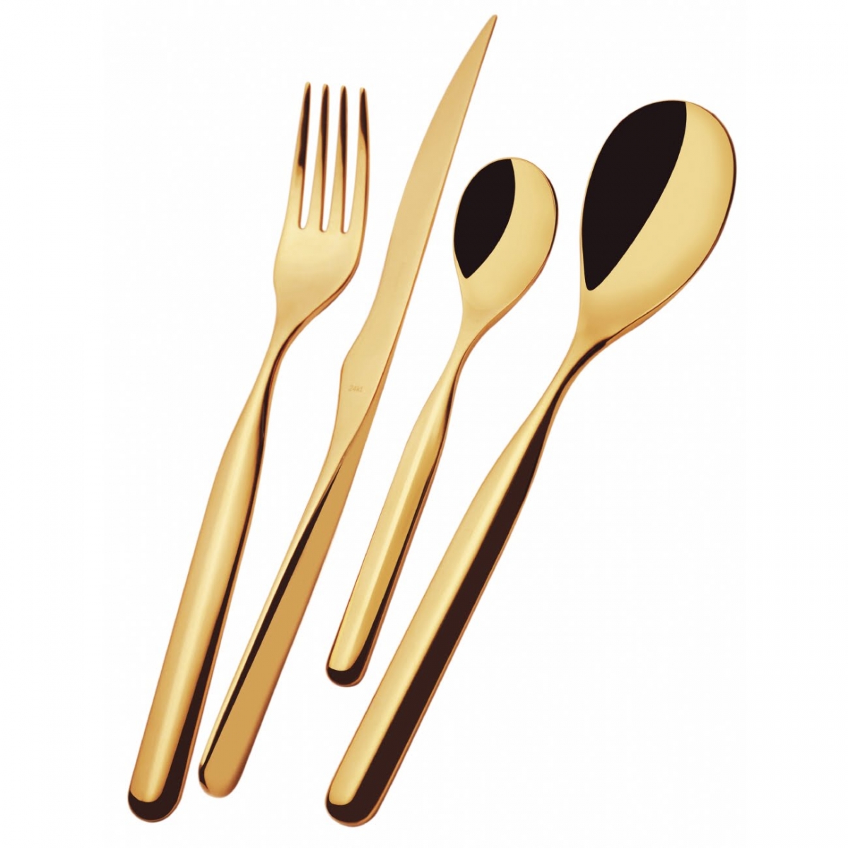 Zestaw sztućców obiadowy 24 szt. Vidal Gold marki Casa Bugatti to propozycja dla osób, które lubią eleganckie nakrycie stołu i nowoczesne wzornictwo. Kolekcja została zaprojektowana przez Elisabeth Vidal, a jej charakter wyróżnia smukła linia, złoty kolor i dekoracyjne wykończenie w postaci powłoki PVD.