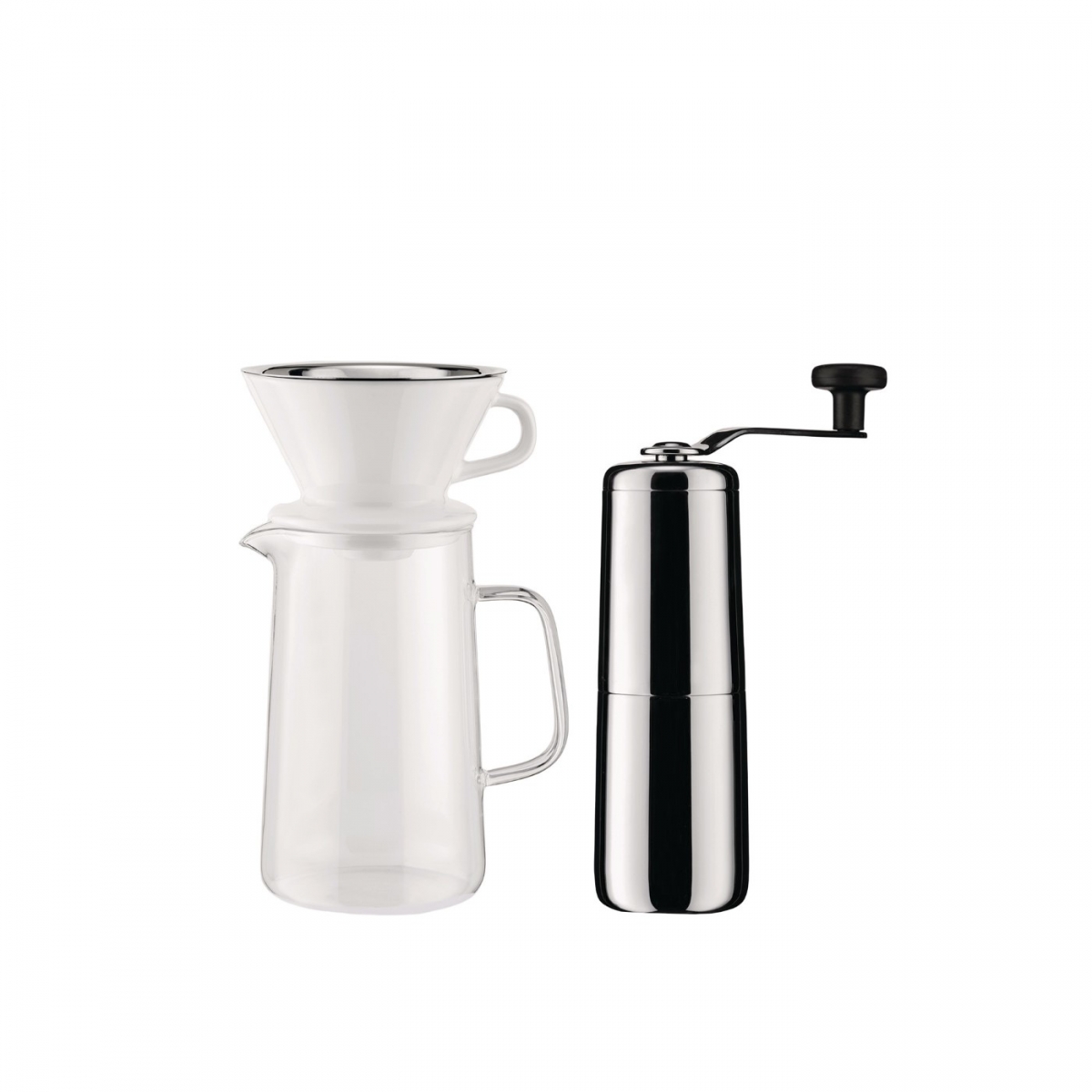 Zestaw do kawy Slow od Alessi. Zestaw Slow do kawy Keiji Takeuchi x Alessi to innowacyjne podejście do parzenia kawy. Młynek i filtr ze stali nierdzewnej 18/10, dzbanek ze szkła żaroodpornego oraz porcelanowy uchwyt na filtr łączą rytuał i zachowanie aromatu. Parzenie kawy staje się wyjątkowym doświadczeniem, a dłuższa metoda parzenia pozwala cieszyć się intensywnymi smakami. Idealny dla kawowych koneserów.