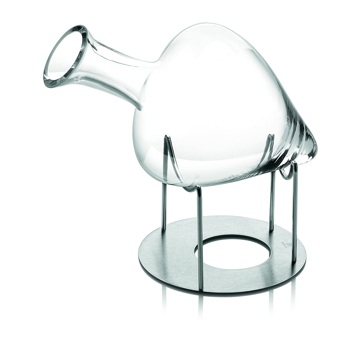 Elegancka karafka La Sposa to połączenie wyrafinowanego rzemiosła i funkcjonalności. Wykonana z przezroczystego, dmuchanego szkła, osadzona jest na stylowym metalowym stojaku, który nie tylko podkreśla jej unikatowy kształt, ale także ułatwia serwowanie wina.