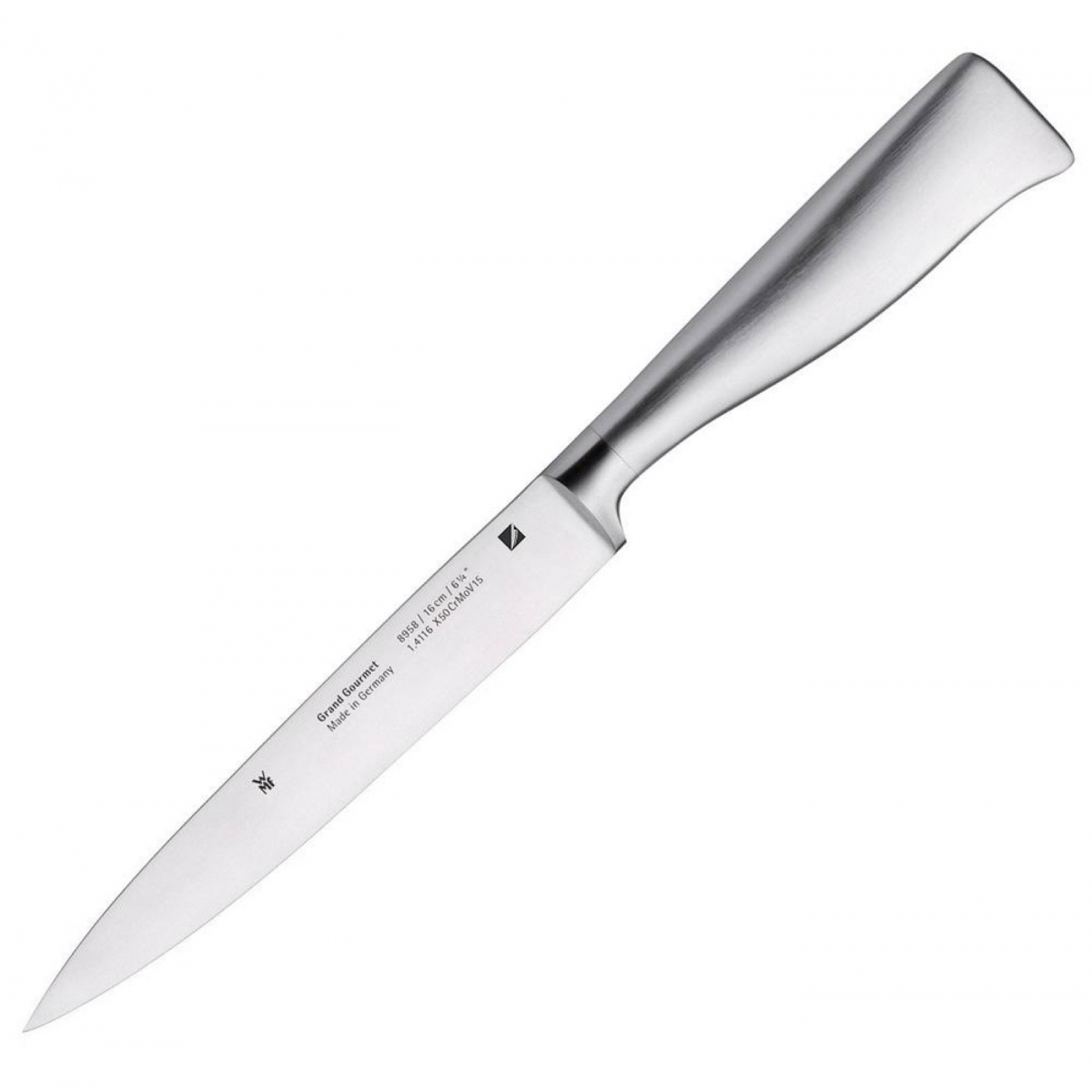 Nóż do filetowania z kolekcji Grand Gourmet marki WMF. Ostrze z kutej stali nierdzewnej jest solidne i trwałe, utrzymując długotrwałą ostrość dzięki innowacyjnej technologii Performance Cut. Bezpieczeństwo użytkowania zapewnia kuta nasada między ostrzem a rękojeścią, a higieniczne doświadczenie jest wynikiem płynnego przejścia między ostrzem a ergonomicznym uchwytem ze stali nierdzewnej Cromargan.