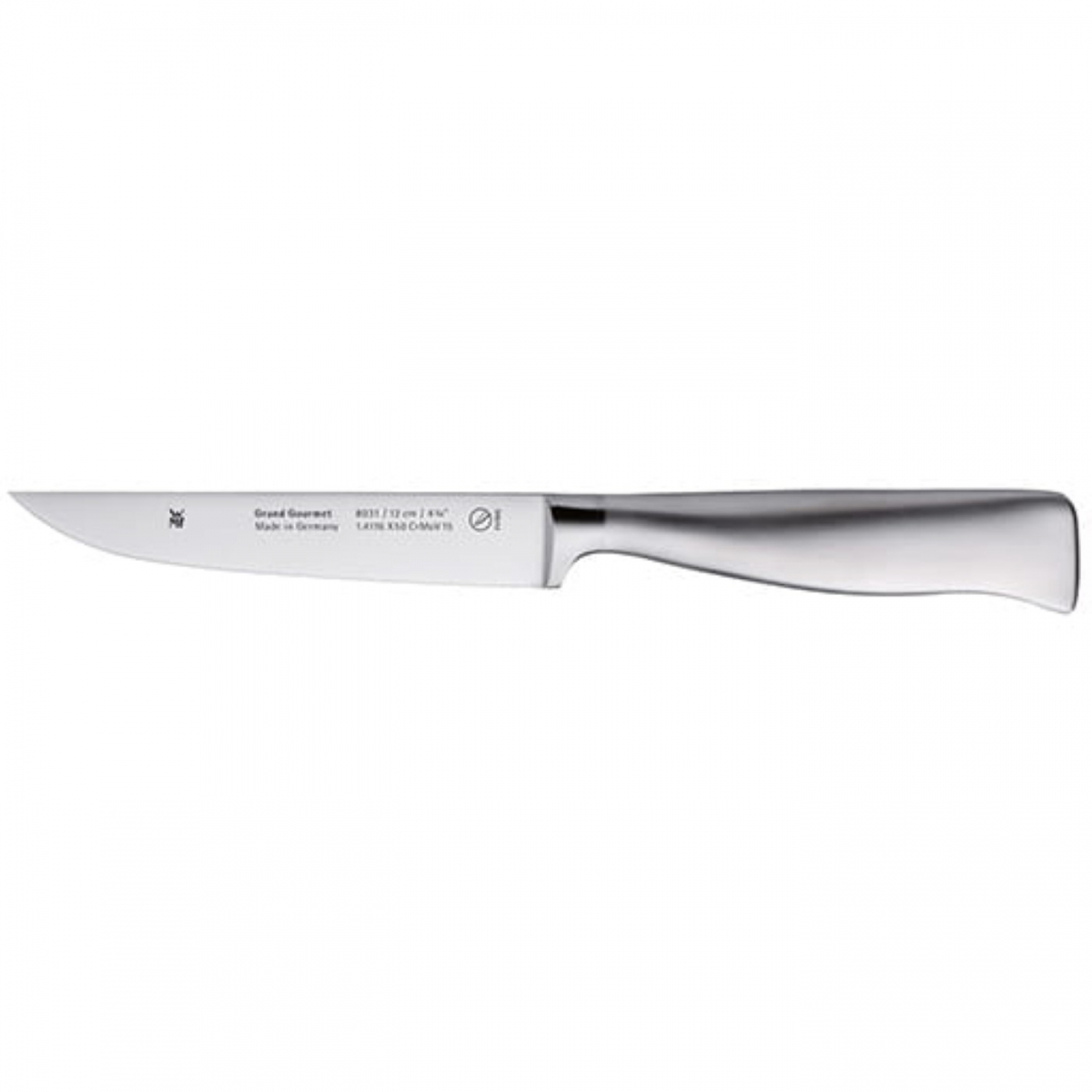 Nóż uniwersalny z kolekcji Grand Gourmet marki WMF do krojenia surowych warzyw, owoców, wędlin, salami i innych produktów. Ostrze z kutej stali nierdzewnej zapewnia solidność i trwałą ostrość, dzięki połączeniu tradycyjnego wykuwania ostrza z najnowszą technologią. Kuta nasada między ostrzem a rękojeścią chroni przed skaleczeniem, a ergonomiczny uchwyt ze stali nierdzewnej Cromargan gwarantuje higieniczne i komfortowe użytkowanie.