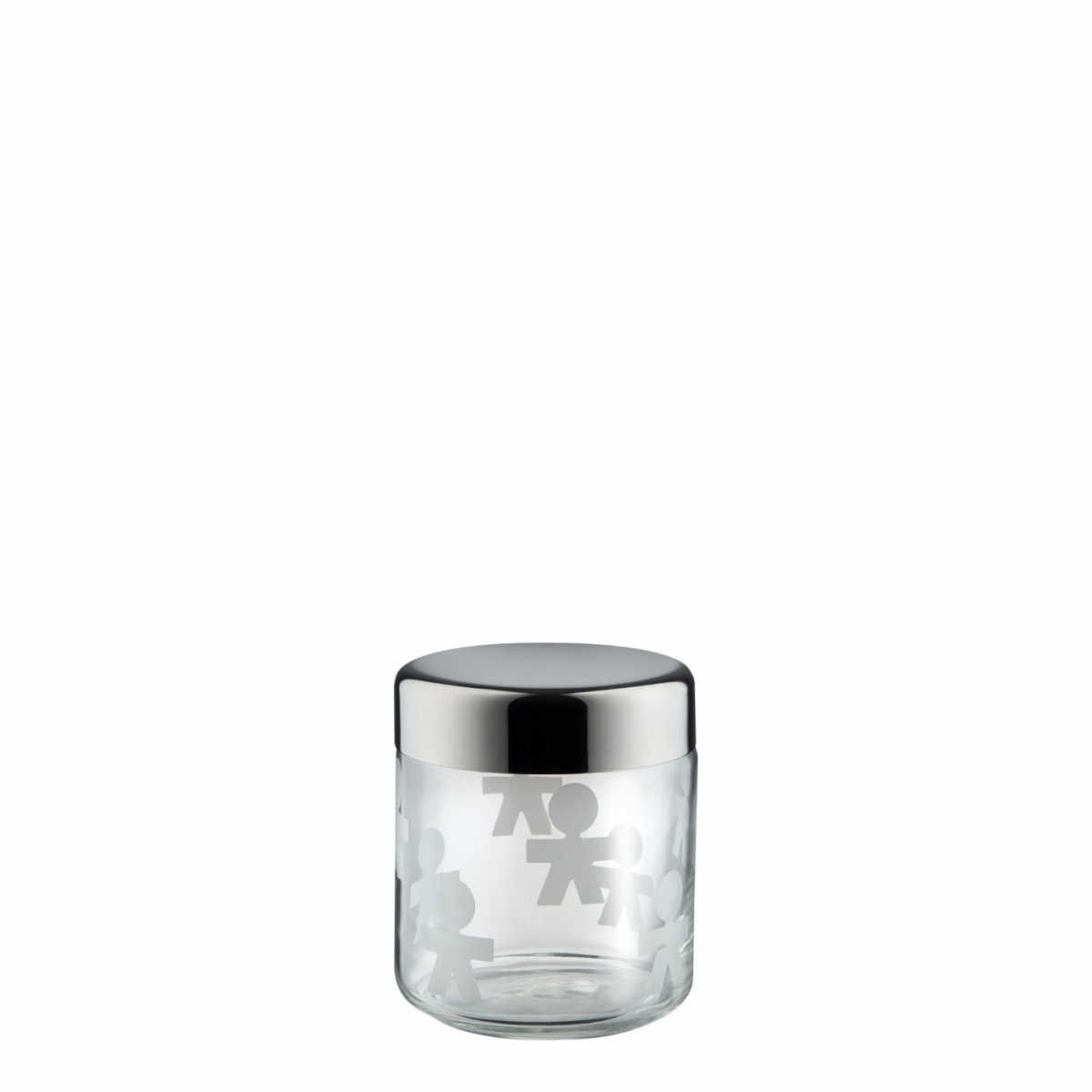 Pojemnik kuchenny Girotondo od Alessi. Słoik ze szkła z motywem Girotondo naniesionym metodą sitodruku posiada szczelną polerowaną pokrywkę. Ludzie kreskówek są ozdobą pojemnika, pojawiają się również na innych przedmiotach do kuchni i na stół.