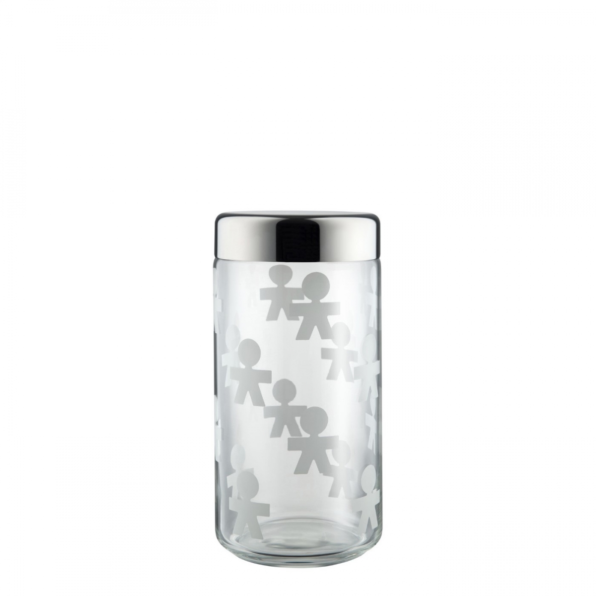 Pojemnik kuchenny Girotondo od Alessi. Słoik ze szkła z motywem Girotondo naniesionym metodą sitodruku posiada szczelną polerowaną pokrywkę. Ludzie kreskówek są ozdobą pojemnika, pojawiają się również na innych przedmiotach do kuchni i na stół.