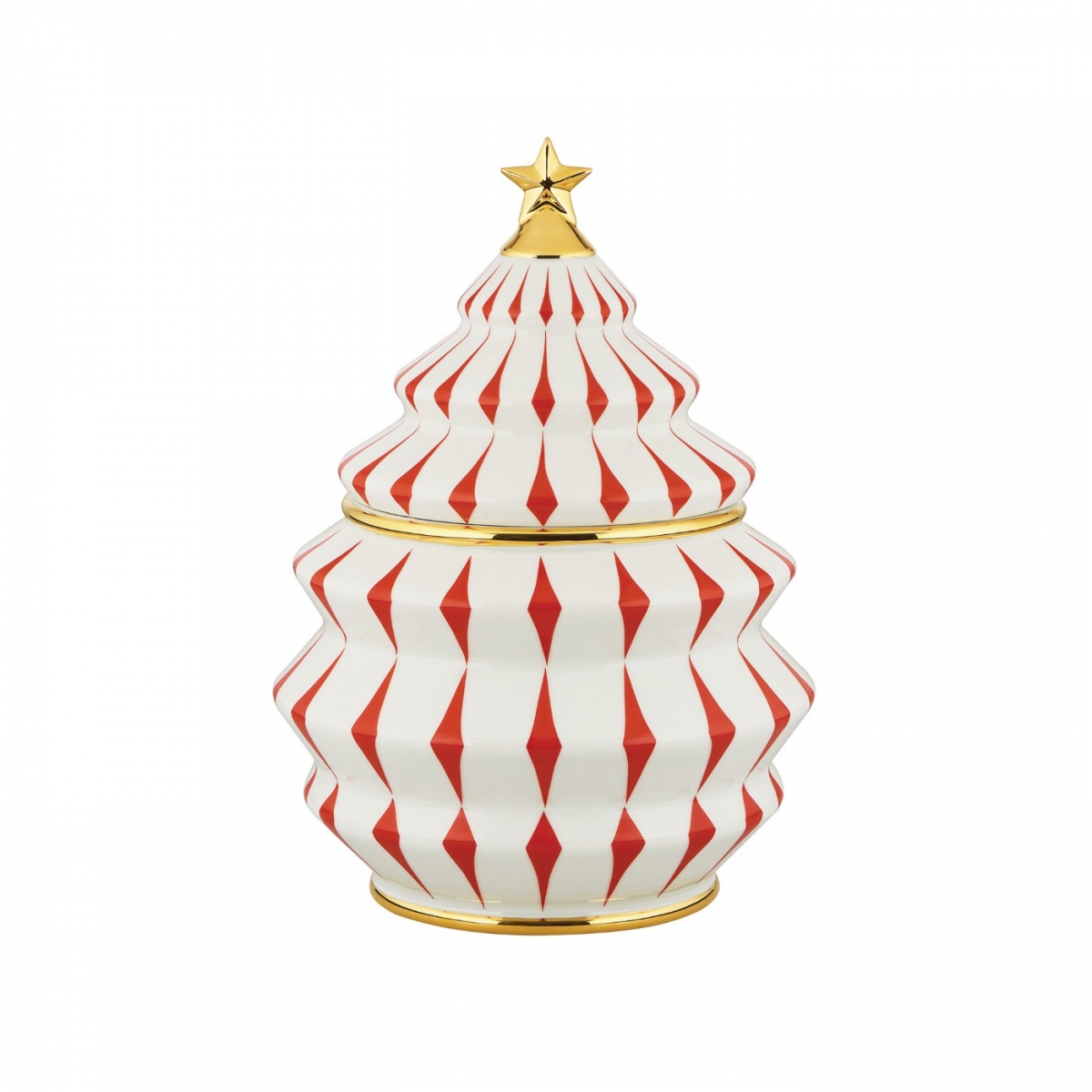Pojemnik na ciastka porcelanowy Delight marki Alessi zdobiony ręcznie techniką kalkomanii, detale dodane przy użyciu złotej emalii. Pojemny i elegancki, idealny do serwowania deserów i suszonych owoców. Nika Zupanc zaprojektowała pojemnik na ciasteczka, którego kształt przypomina ośnieżoną choinkę. Tradycyjne kształty i tradycyjne kolory świąteczne: biel, czerwień i złoto na małą gwiazdkę, która pełni funkcję uchwytu na pokrywce oraz na