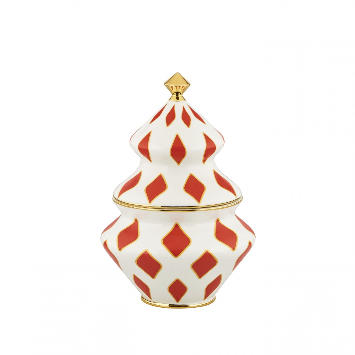 Pojemnik na ciastka porcelanowy Delight marki Alessi zdobiony ręcznie techniką kalkomanii, detale dodane przy użyciu złotej emalii. Pojemny i elegancki, idealny do serwowania deserów i suszonych owoców. Nika Zupanc zaprojektowała pojemnik na ciasteczka, którego kształt przypomina ośnieżoną choinkę. Tradycyjne kształty i tradycyjne kolory świąteczne: biel, czerwień i złoto na małą gwiazdkę, która pełni funkcję uchwytu na pokrywce oraz na