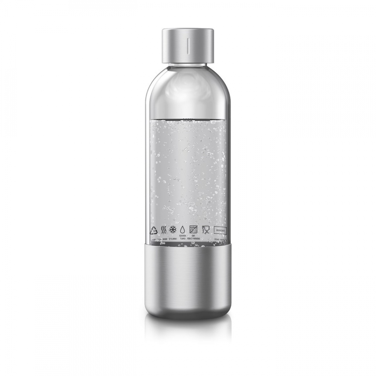Butelka wymienna do saturatora WMF Element One o pojemności 0,75 l, wykonana z trwałego tworzywa PET i stali nierdzewnej. Stalowe elementy są zdejmowane, a na korpusie umieszczono datę minimalnej przydatności. Przeznaczona wyłącznie do mycia ręcznego.
