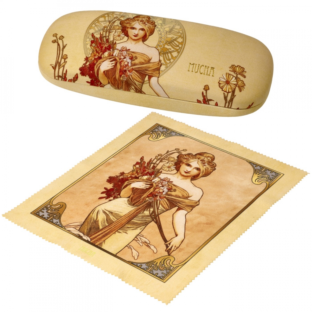 Futerał na okulary z reprodukcją obrazu Alfonsa Muchy - Wiosna od firmy Goebel. Solidna, twarda obudowa z pokryciem z tkaniny, przyjemny w dotyku, mocne i bezpieczne metalowe zapięcie, wewnątrz obudowy wyłożone miękkim filcem, wymiary 16 x 4,5 cm, pasuje do wszystkich popularnych rozmiarów okularów. W komplecie znajduje się ściereczka z mikrofibry 15 x 18 cm.