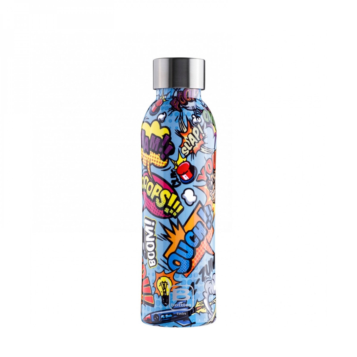 B Bottles Comics od Bugatti to praktyczna, ultralekka butelka termiczna na wodę do wielokrotnego użytku. Ergonomiczny kształt ułatwia pewny chwyt, a wykonanie z pojedynczej ścianki ze stali nierdzewnej sprawia, że jest lekka i łatwa do przenoszenia.