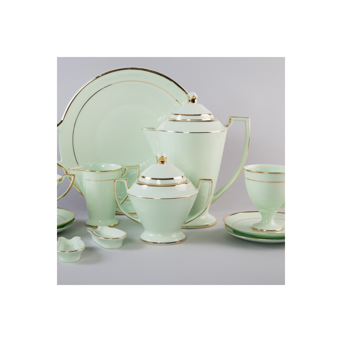 Cukiernica Pola - urocza i delikatna z niezwykle cienkiej porcelany to projekt fabryki AS Ćmielów. Cukiernica wykonana i zdobiona ręcznie z najwyższej jakości szmaragdowej porcelany, dekorowana 24-karatowym złotem.