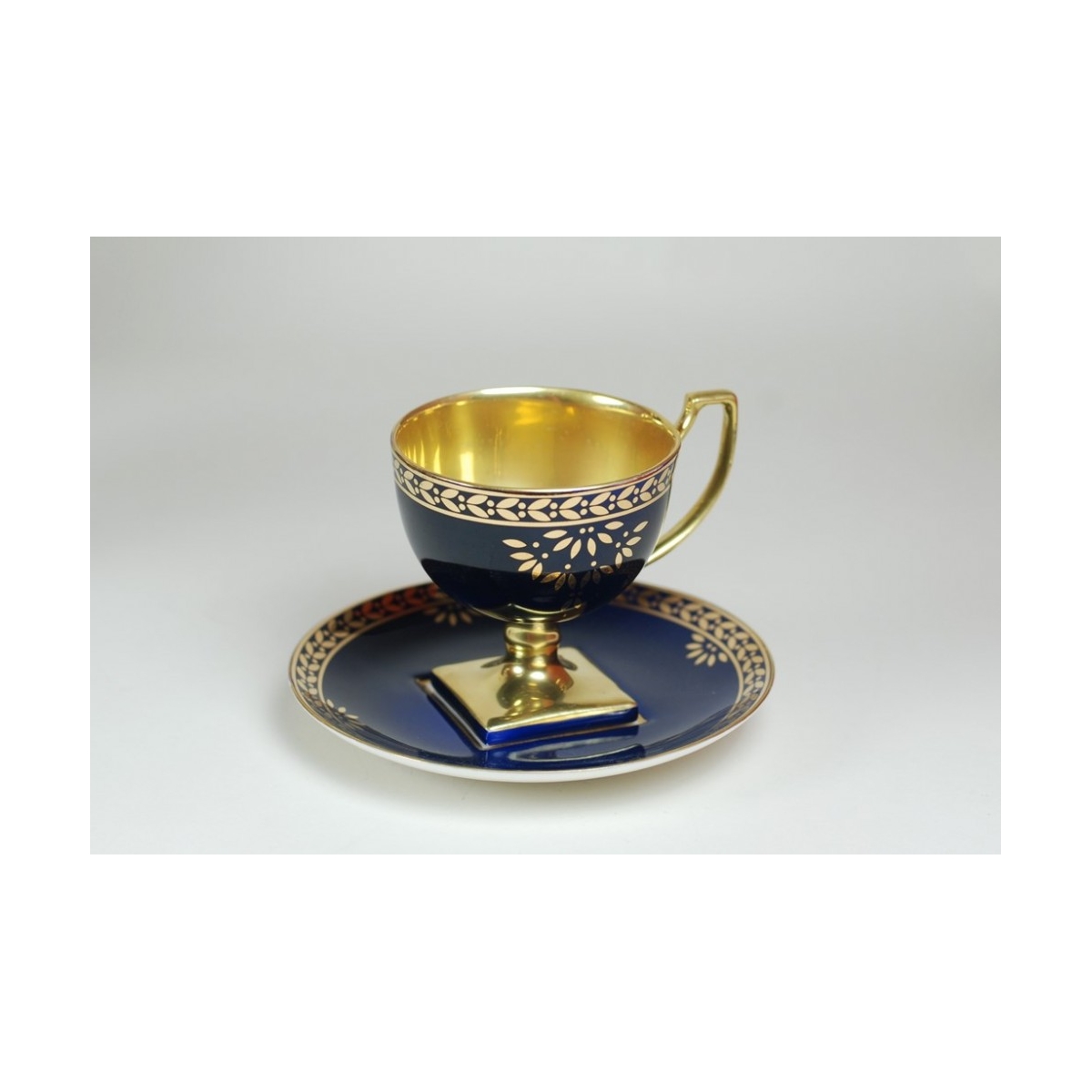 Filiżanka jest ręcznie dekorowana kobaltem i 24 karatowym płynnym złotem.