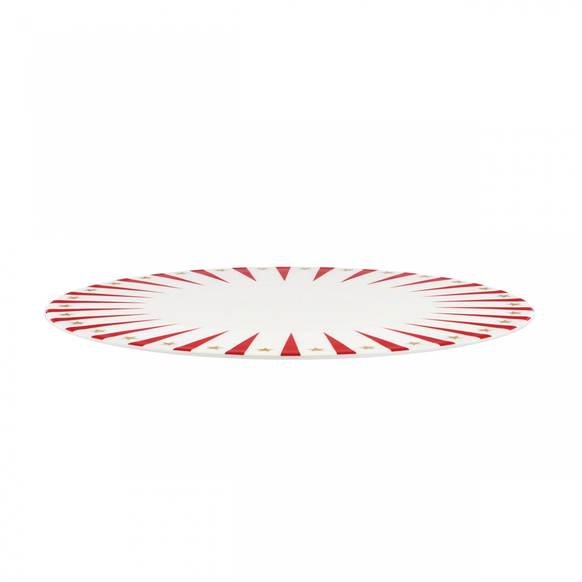 Porcelanowy talerz z kolekcji Delight marki Alessi to elegancki sposób na podanie świątecznego panettone lub innych deserów. Zaprojektowany przez Nikę Zupanc, łączy klasyczne świąteczne kolory – biel, czerwień i złoto – w nowoczesnym, geometrycznym wzorze przypominającym koronę gwiazd.