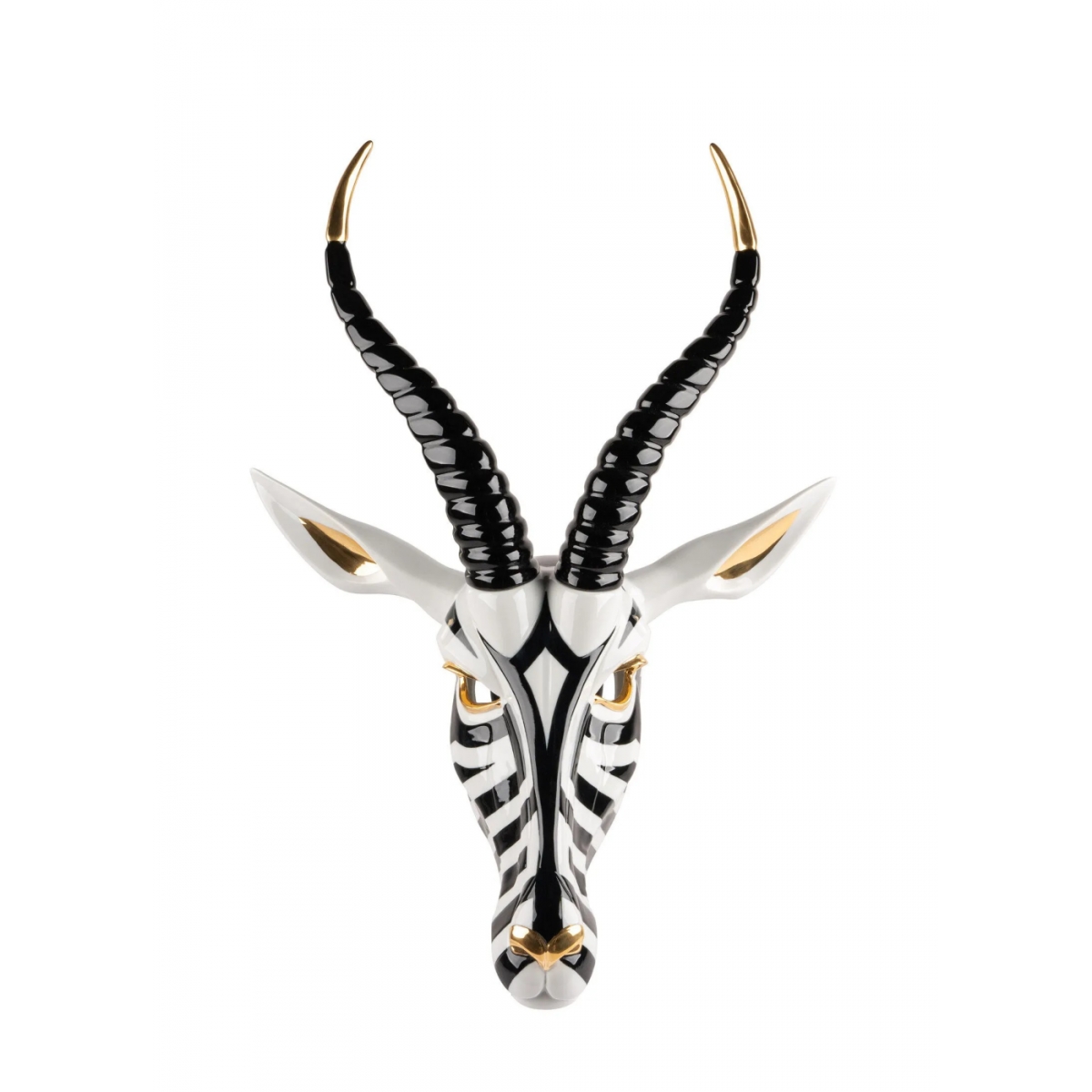 Maska z porcelany - antylopa w kolorach: czarny, biały i złoty, inspirowana tradycyjnymi afrykańskimi maskami o odważnym, współczesnym i nowoczesnym designie z kolekcji Lladró. Piękna dekoracja. Kolekcja skupiająca różne zwierzęta.