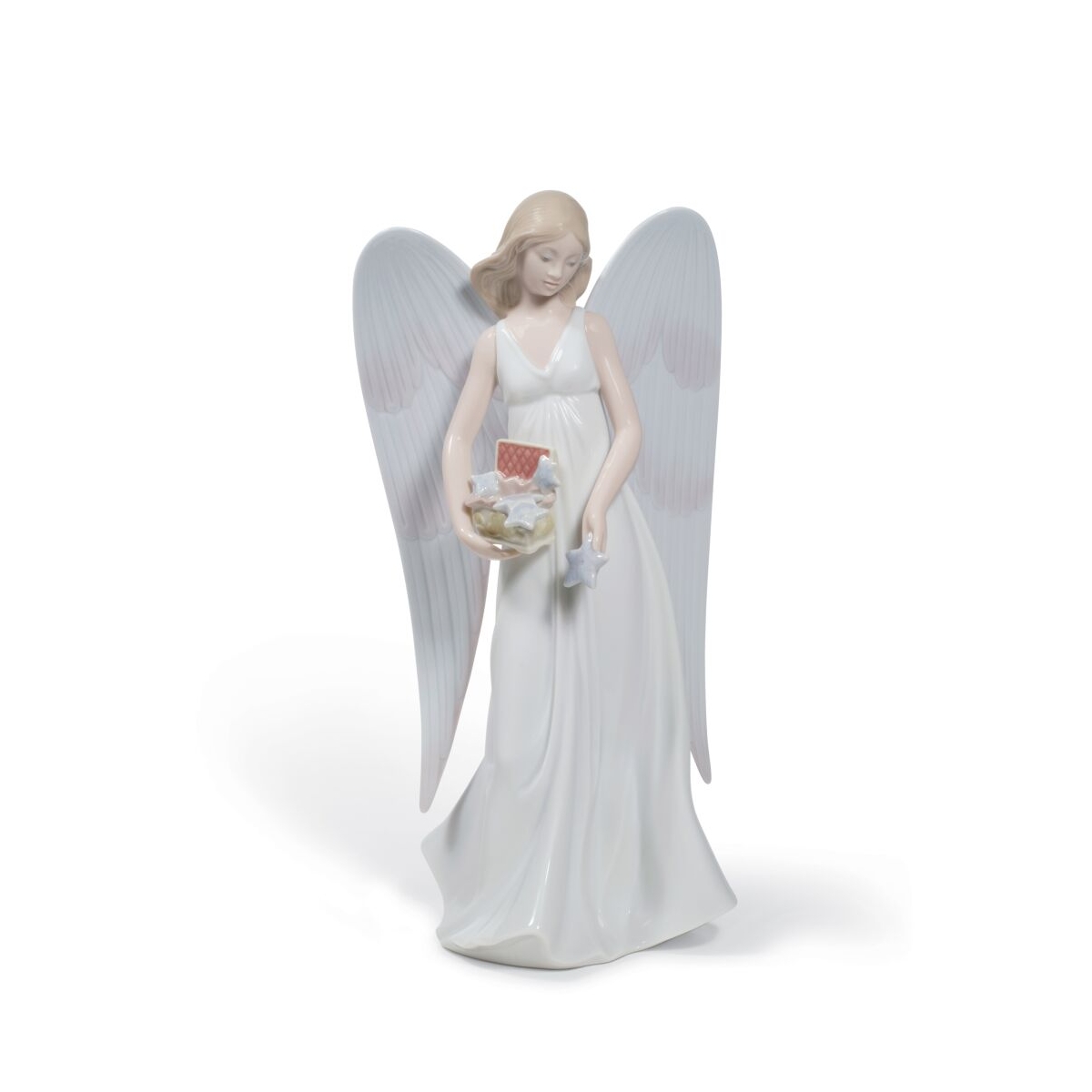 Figurka z porcelany - do ozdobienia czubka choinki w kształcie anioła z pudełkiem w ręce pełnej gwiazd. W niebie każdy anioł ma zadanie do wykonania. Rolą tej pięknej cherubiny jest rozproszenie nieba gwiazdami, które wyjmuje z magicznej skrzyni. Piękna dekoracja domu na Boże Narodzenie od Lladro.