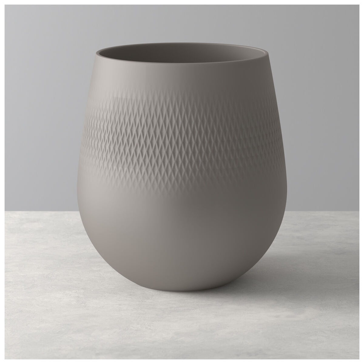 Duży porcelanowy wazon Carré w modnym kolorze o ciekawej strukturze z serii Collier terre. Piękna dekoracja od Villeroy & Boch. W kolekcji znajdują się wazony w różnych rozmiarach i można je ciekawie ze sobą łączyć, uzyskując fantastyczny efekt i harmonijne ozdobne akcenty w domu. Bujny bukiet letnich i wiosennych kwiatów w tym wazonie stanie się ekskluzywnym ozdobnym akcentem w salonie.