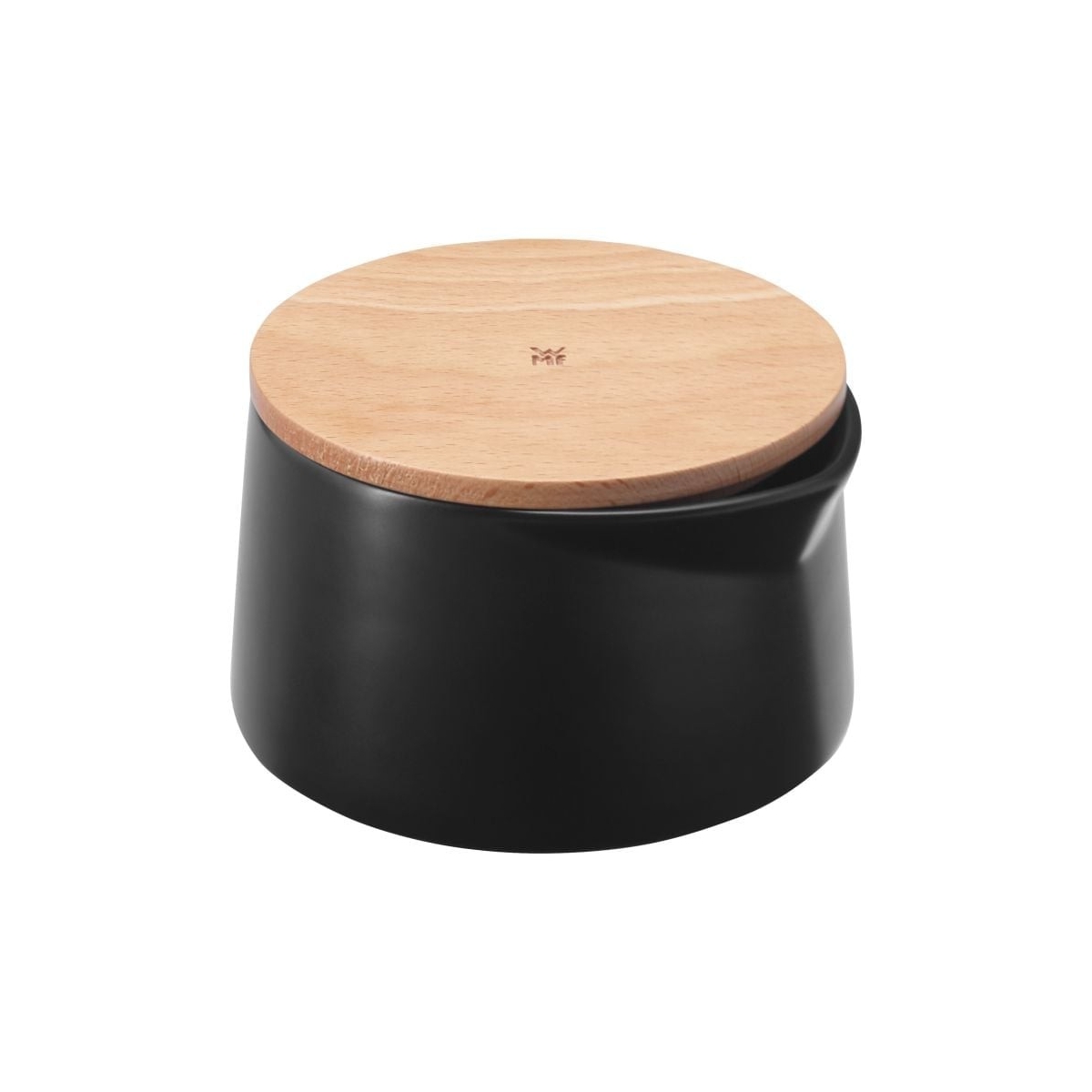 Stylowa cukierniczka Kineo WMF w matowym, czarnym kolorze to elegancki dodatek do każdej kuchni. Wykonana z wysokiej jakości kamionki, posiada drewnianą pokrywkę oraz praktyczny dzióbek umożliwiający wygodne przechowywanie łyżeczki. Można myć w zmywarce (bez pokrywki), co ułatwia codzienne użytkowanie. Połączenie kamionki i drewna bukowego nadaje jej ponadczasowy charakter.