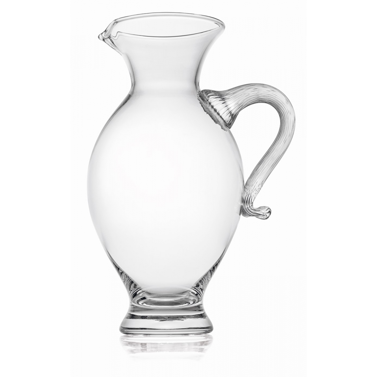 Szklany dzbanek o pojemności gładką powierzchnią zewnętrzną i ozdobnym, żebrowanym uchwytem, wyraźną fakturą inspirowaną pustynnymi wzorami. Idealny do serwowania większej ilości napojów – funkcjonalny i stylowy wybór na każdy stół.