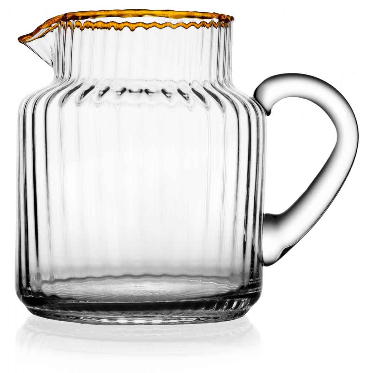 Przezroczysty dzbanek z pomarańczową krawędzią z dmuchanego szkła, wyróżniający się klasycznym kształtem i elegancką pionową strukturą typu canneté. Doskonała do serwowania wszelkiego rodzaju napojów – sprawdzi się zarówno w codziennym użytkowaniu, jak i na bardziej uroczystych stołach.