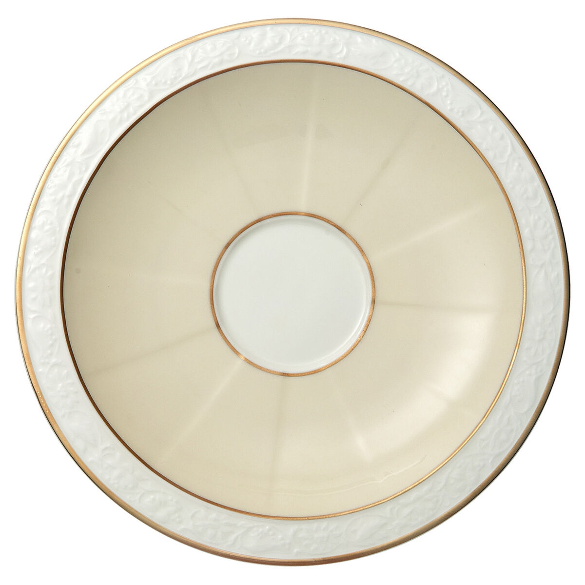 Spodek do filiżanka do kawy lub herbaty z kolekcji Ivoire marki Villeroy & Boch. Elegancka i luksusowa tak można określić kolekcję Ivoire. Wykonana jest z wysokiej jakości porcelany kostnej ozdobionej złotymi krawędziami, stylowymi wzorami oraz subtelnymi reliefami. Połączenie odcieni kości słoniowej, złotych dodatków i bieli.