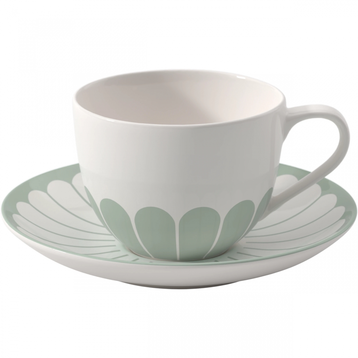 Filiżanka do kawy ze spodkiem Fleur Vert od Villeroy & Boch to połączenie stylu i funkcjonalności w najwyższej jakości porcelanie. Filiżanka ze spodkiem zachwyca subtelnym zielonym odcieniem, który wprowadza do wnętrz świeżość, a nowoczesny, graficzny wzór inspirowany klasycznymi motywami kwiatowymi dodaje jej elegancji.