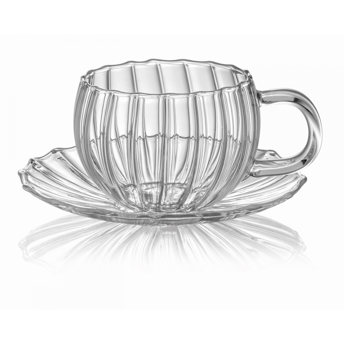 Szklany zestaw 2 filiżanek ze spodkami z charakterystyczną, wyraźną fakturą inspirowaną pustynnymi wzorami. Idealne do serwowania kawy – funkcjonalny i stylowy wybór na każdy stół.