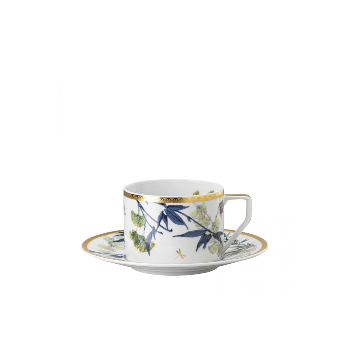 Filiżanka do herbaty ze spodkiem „Turandot” z kolekcji Rosenthal Heritage to połączenie klasycznej porcelany z bogatą, orientalną estetyką. Projekt autorstwa Gianniego Cinti czerpie inspirację z chińskich pejzaży – ozdobiony jest kompozycją kwiatów piwonii, liści bambusa, miłorzębu oraz subtelnych ważek, a całość uzupełniają eleganckie złocenia.
