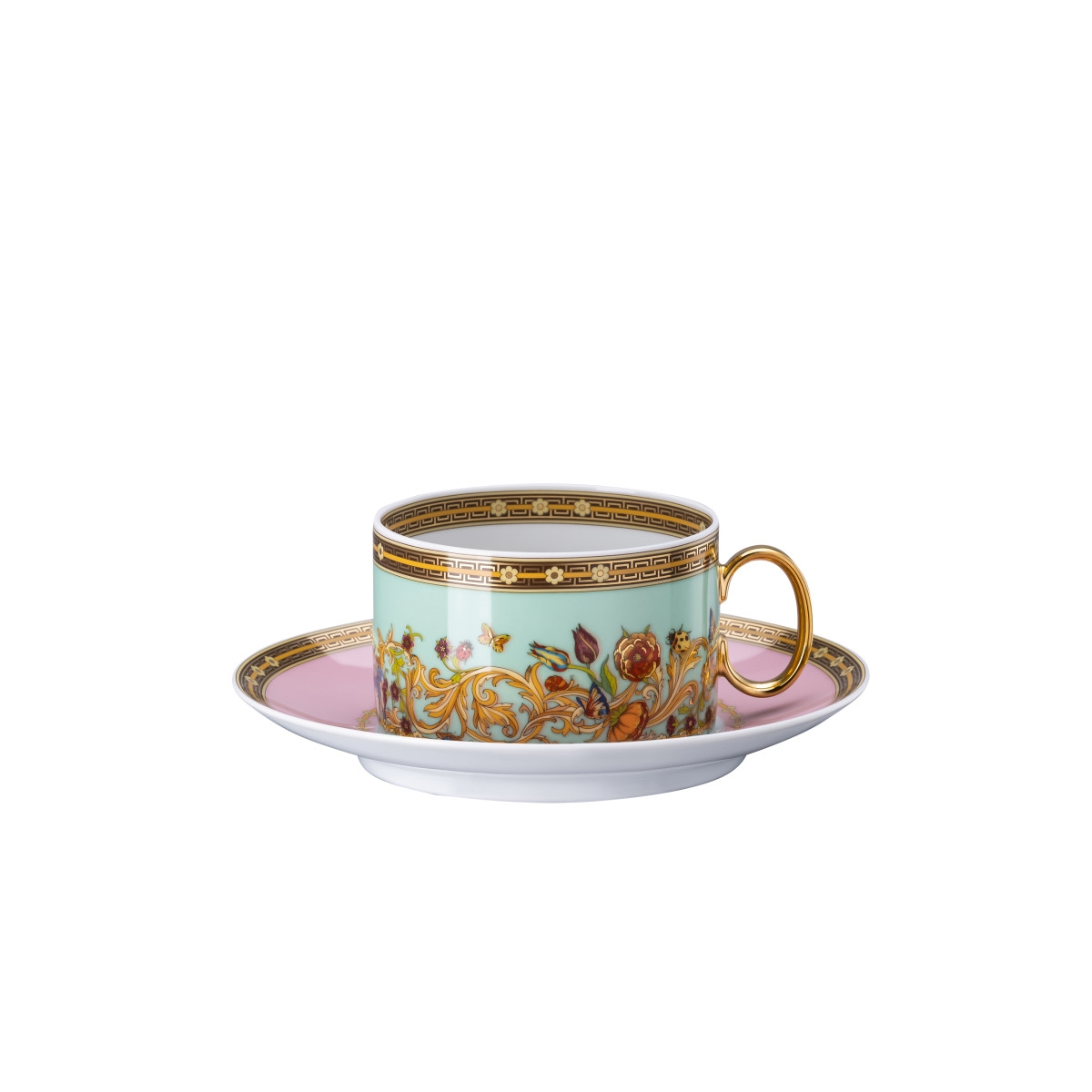 Kolekcja Ogród Motyli Modern Dining łączy klasyczną elegancję Rosenthal z charakterystycznym stylem domu mody Versace. Porcelanowa filiżanka z delikatnym spodkiem zachwyca bogatym, barwnym wzorem inspirowanym naturą i motylami — symbolem lekkości, wolności i luksusu.