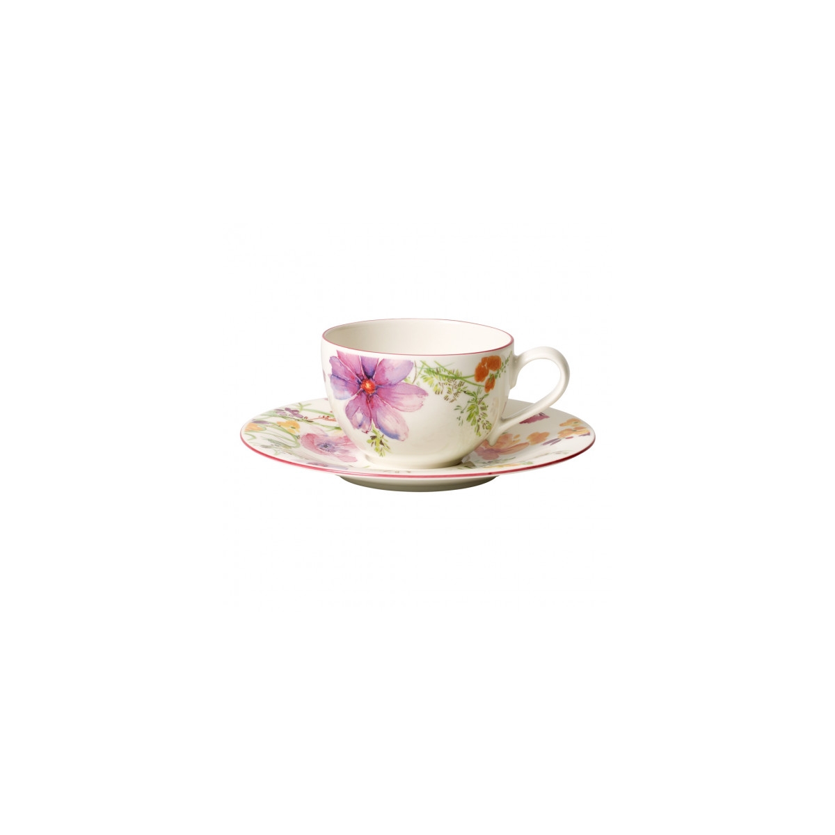 Filiżanka do kawy 0,25 l ze spodkiem 16 cm stanowi część nowoczesnej zastawy stołowej z kolekcji Mariefleur Basic firmy Villeroy & Boch. Zainspirowany ogrodami Moneta w Givenchy, kolorowa gra między delikatnymi trawami łąkowymi a akwarelowymi kwiatami w żywych odcieniach fioletu i żółci doda odrobinę letniego ogrodu do stołu.