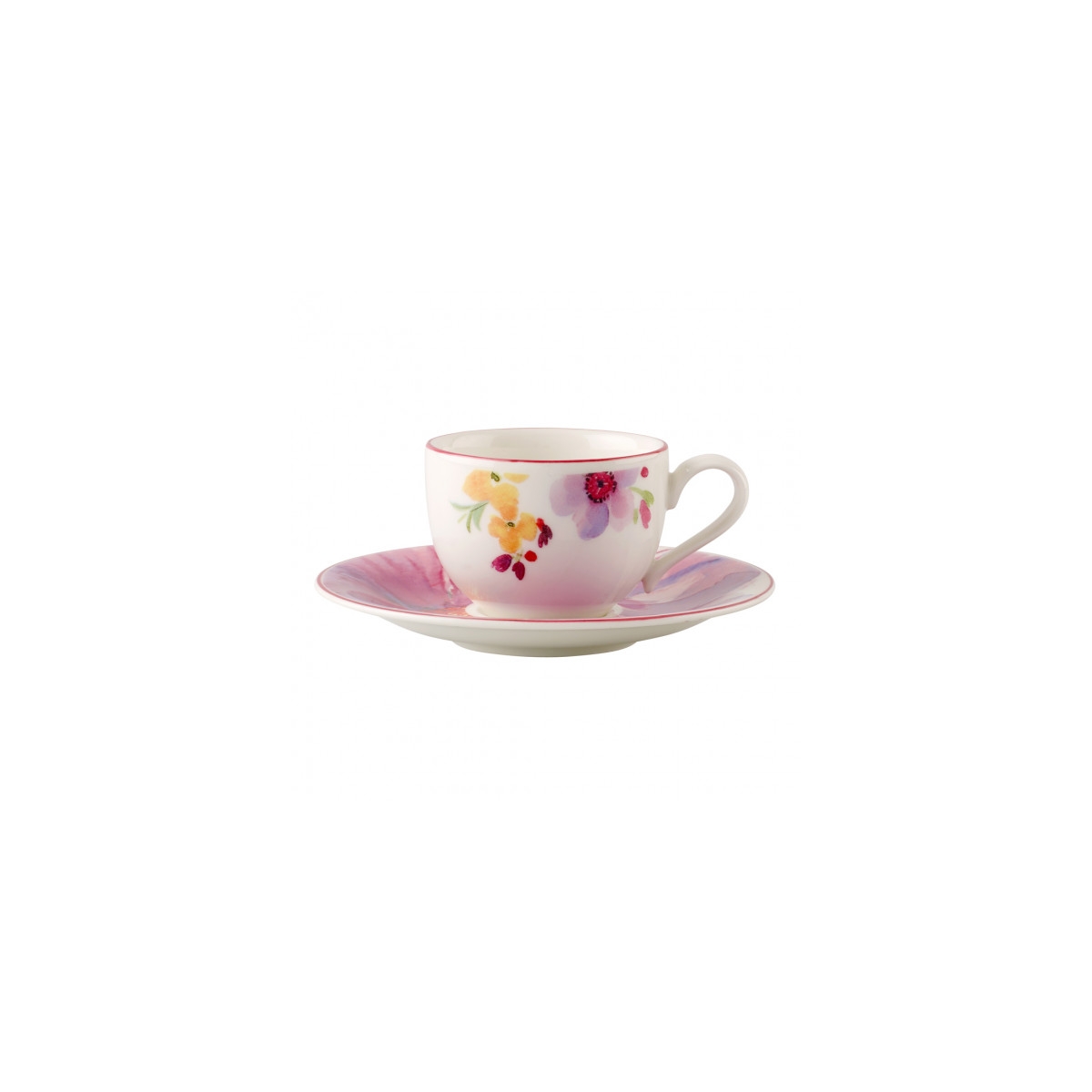 Filiżanka do espresso 0,08 l ze spodkiem 12 cm stanowi część nowoczesnej zastawy stołowej z kolekcji Mariefleur Basic firmy Villeroy & Boch. Zainspirowany ogrodami Moneta w Givenchy, kolorowa gra między delikatnymi trawami łąkowymi a akwarelowymi kwiatami w żywych odcieniach fioletu i żółci doda odrobinę letniego ogrodu do stołu.