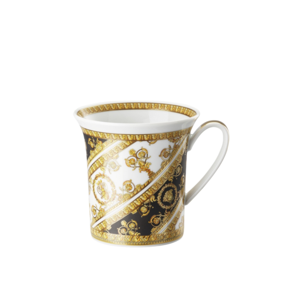 Porcelanowy kubek z kolekcji Rosenthal meets Versace, utrzymany w białej kolorystyce z charakterystycznymi złotymi motywami barokowymi. Idealny do kawy, herbaty lub gorącej czekolady, łączy luksusowy design z codzienną funkcjonalnością.