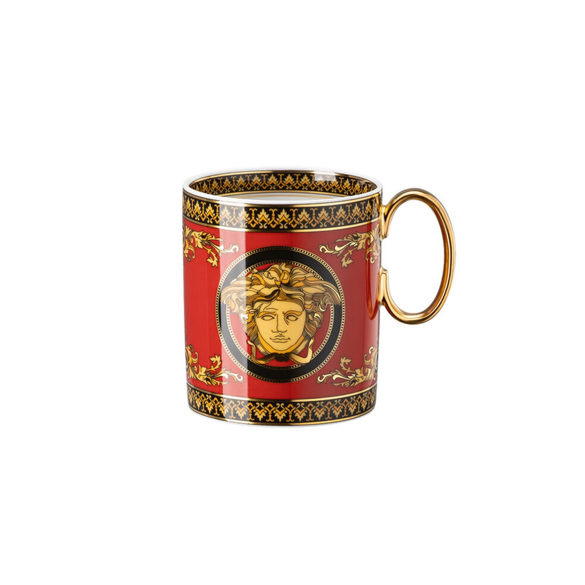 Porcelanowy kubek z kolekcji Rosenthal meets Versace. Utrzymany w intensywnej czerwieni, ozdobiony złotymi motywami i symbolem Meduzy. Elegancki i wyrazisty - idealny do codziennej kawy lub herbaty w stylu Versace.
