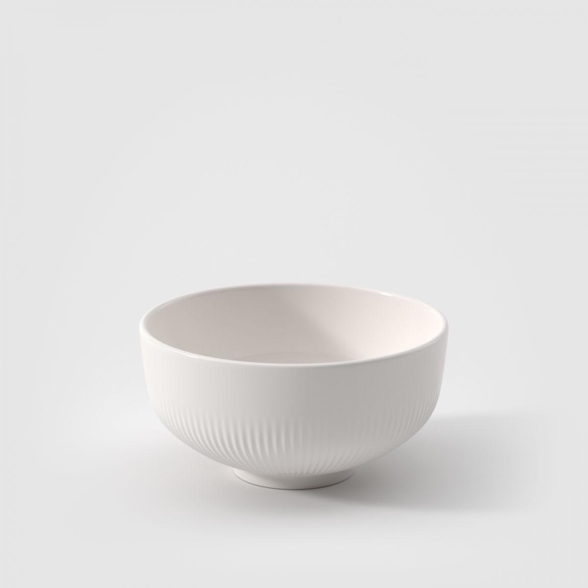 Biała miska, wykonana z wysokiej jakości Premium Porcelain. Idealna do romantycznego nakrycia stołu, pasuje do różnych dań, wprowadzając harmonię i elegancję. Delikatny relief w kształcie pierścienia, inspirowany promieniami słońca, symbolizuje pozytywną energię i nowe początki. Wysokiej jakości kształt coupe podkreśla indywidualność miseczki, zapewniając wyjątkowy wygląd i trwałość.