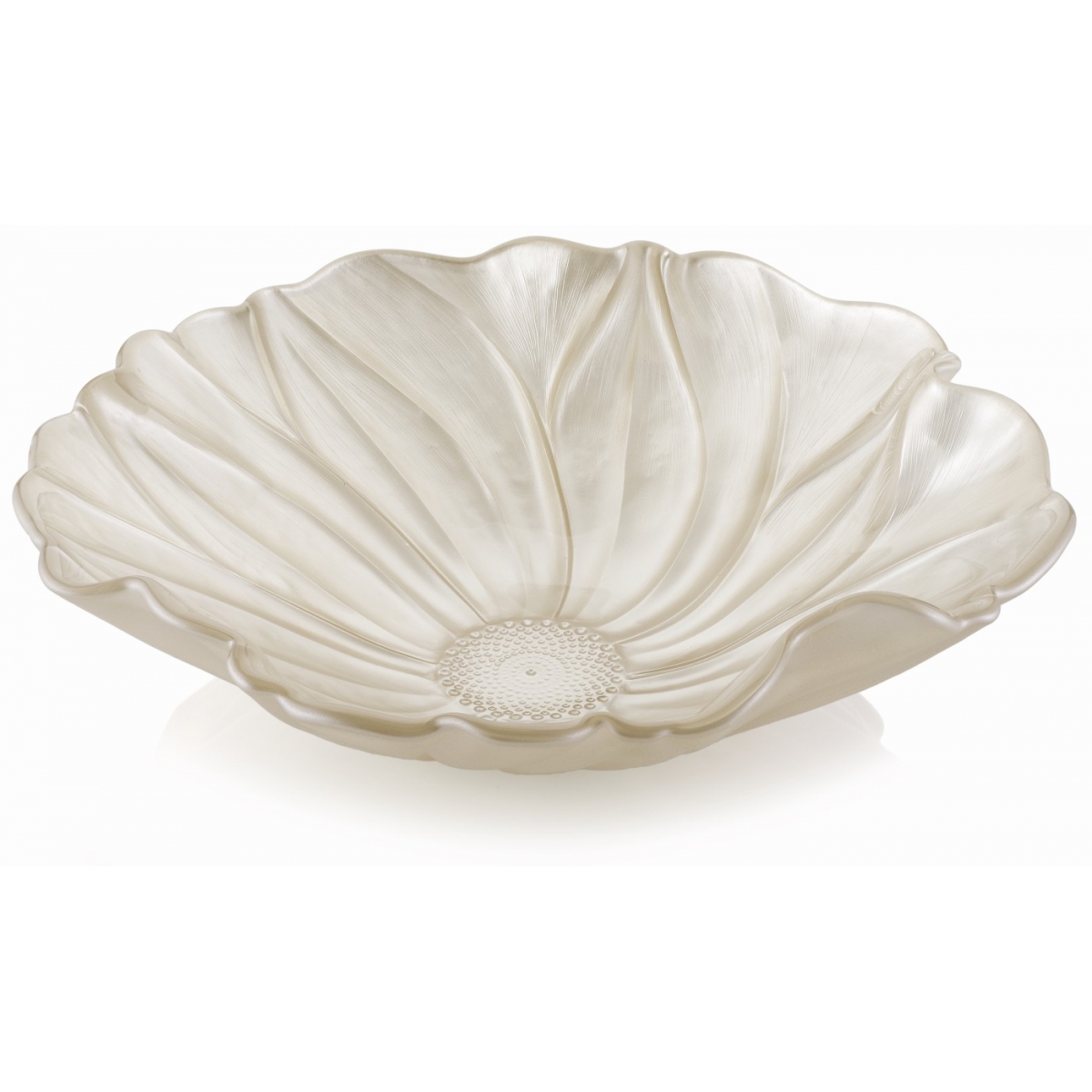 Elegancka misa ze szkła prasowanego z kolekcji Magnolia zachwyca kształtem inspirowanym kwiatem magnolii i perłową dekoracją.