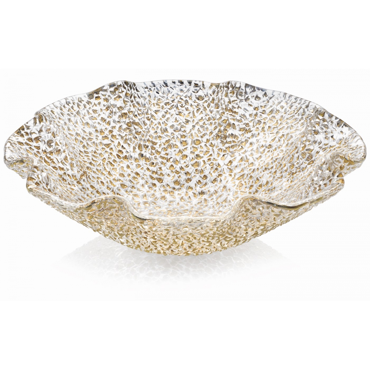 Misa z kolekcji Special, wykonana z przezroczystego, prasowanego szkła. Jej forma przypomina muszlę, a zewnętrzna strona pokryta jest nieregularnym wzorem, który nadaje powierzchni wyjątkową fakturę – pełną blasku i przyjemną w dotyku. Doskonała jako dekoracyjny element stołu lub naczynie do serwowania.