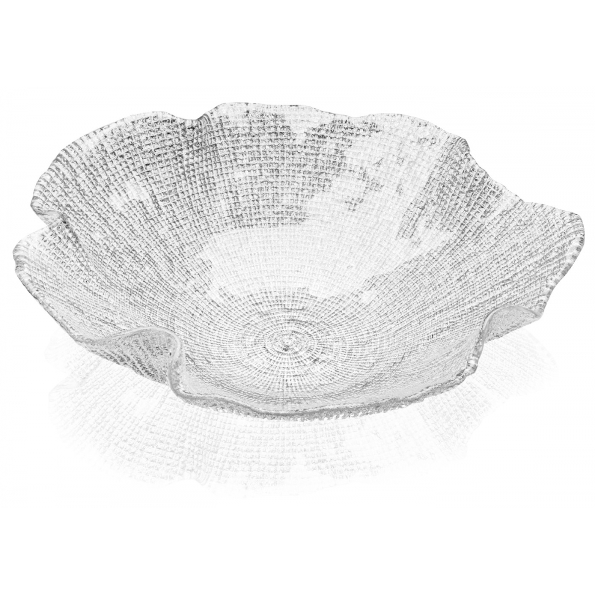 Misa z kolekcji Folies wykonana z przezroczystego szkła prasowanego. Jej zewnętrzna powierzchnia zdobiona jest nieregularnym wzorem, który tworzy efektowną grę światła i faktury – błyszczącą, a zarazem przyjemną w dotyku. Idealna zarówno do serwowania, jak i jako dekoracyjny akcent na stole lub komodzie.