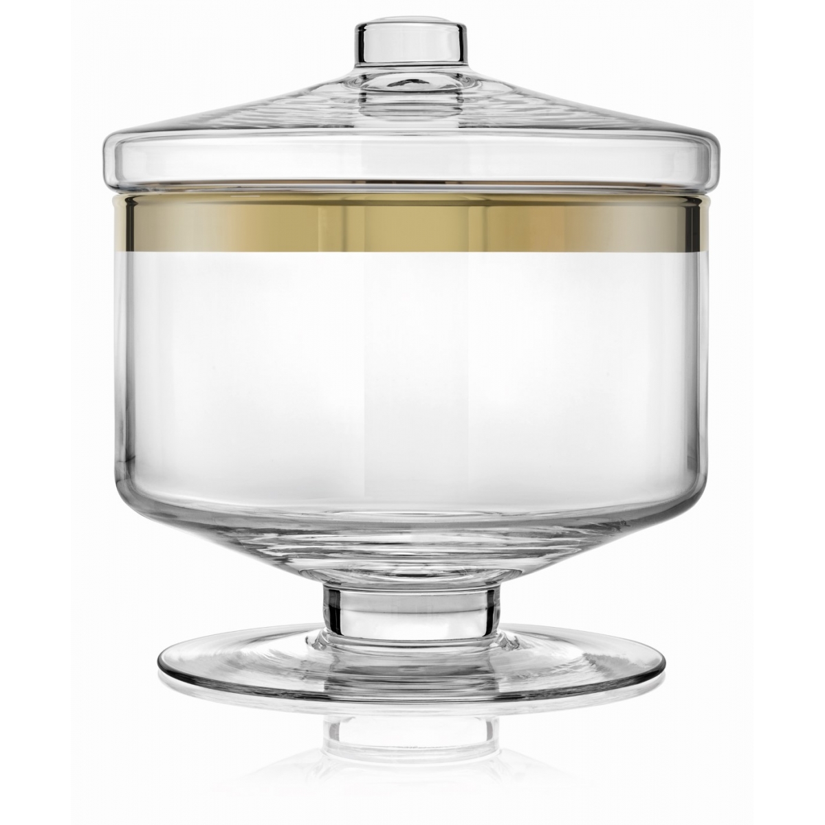Bomboniera z kolekcji Avenue Gold wykonana jest z przezroczystego, dmuchanego szkła. Wyróżnia się prostym, ale eleganckim wzornictwem, którego charakterystycznym elementem jest subtelny złoty pasek zdobiący zewnętrzną powierzchnię. Idealna zarówno do przechowywania drobnych słodkości, jak i jako stylowy element dekoracyjny w nowoczesnym wnętrzu.