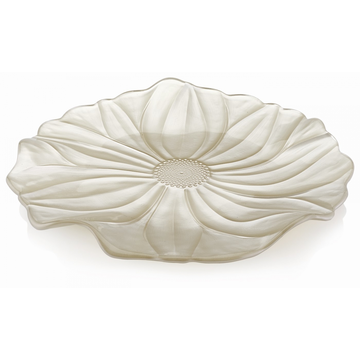 Elegancki półmisek ze szkła prasowanego z kolekcji Magnolia zachwyca kształtem inspirowanym kwiatem magnolii i perłową dekoracją.