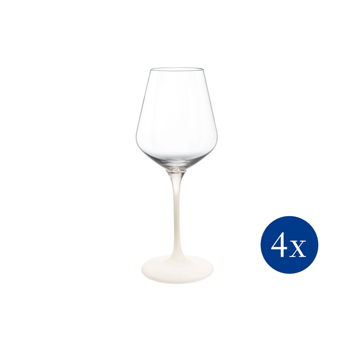 Zestaw czterech kieliszków do białego wina Manufacture Rock Blanc od Villeroy & Boch harmonijnie uzupełnia aranżację stołu. Kolekcja cechuje się purystycznym designem, przypominającym biały łupek, co nadaje im wyjątkowy wygląd. Wykonane z najwyższej jakości szkła kryształowego, zapewniają nie tylko estetyczny wygląd, ale także przyjemne wrażenia dotykowe. Zestaw kieliszków do białego wina składa się z czterech kieliszków, które świetnie leżą w dłoni dzięki swojej unikalnej fakturze. Matowa biała nóżka dodaje im elegancji, tworząc harmonijną kompozycję z dekoracją stołu i zapewniając niezwykłe doznania podczas kolacji.