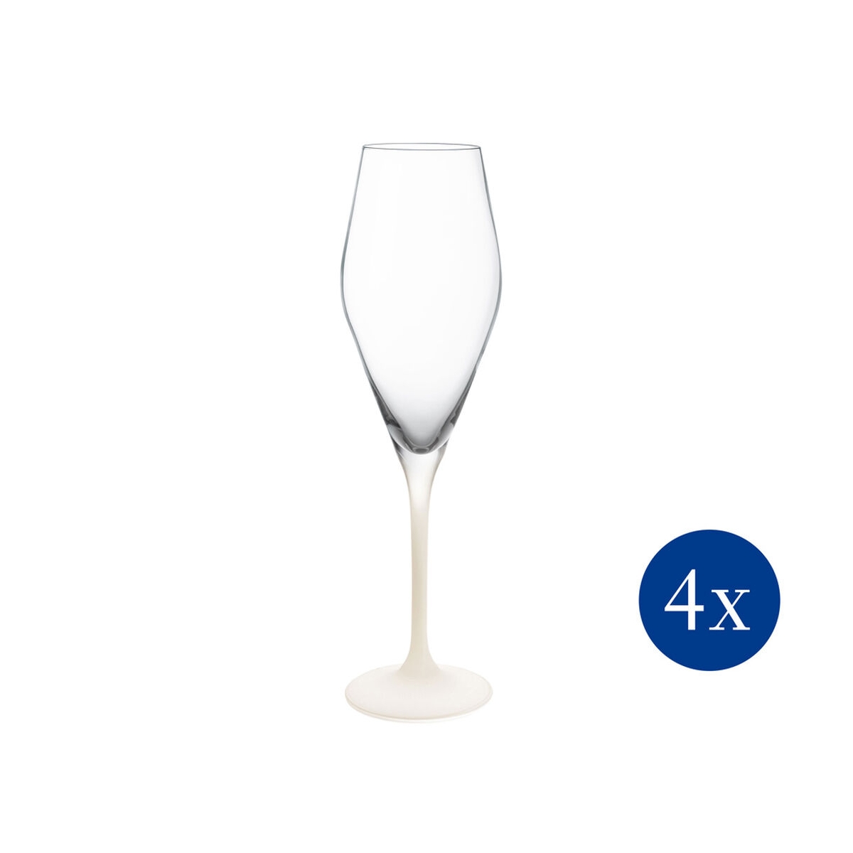 Zestaw czterech kieliszków do szampana Manufacture Rock Blanc od Villeroy & Boch harmonijnie uzupełnia aranżację stołu. Kolekcja cechuje się purystycznym designem, przypominającym biały łupek, co nadaje im wyjątkowy wygląd. Wykonane z najwyższej jakości szkła kryształowego, zapewniają nie tylko estetyczny wygląd, ale także przyjemne wrażenia dotykowe. Zestaw kieliszków do szampana Manufacture Rock blanc obejmuje cztery kieliszki, które doskonale leżą w dłoni dzięki swojej wyjątkowej fakturze.