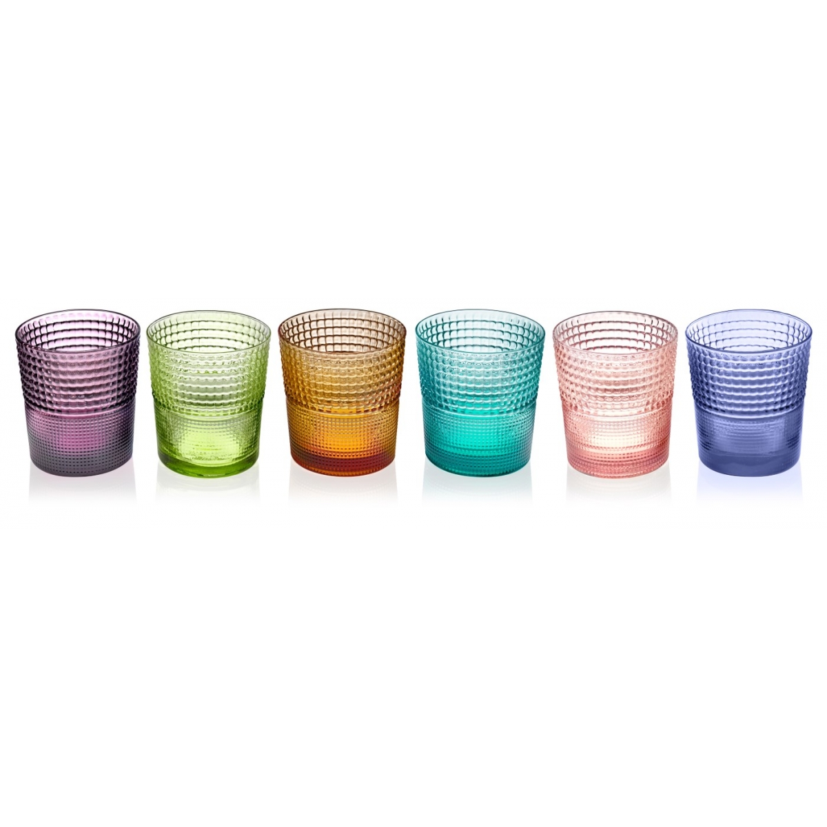 Zestaw 24 szklanek wykonanych z dmuchanego szkła barwionego w masie. Szklanki z kolekcji Speedy wyróżniają się efektowną podwójną optyką, która nadaje im wyjątkowego charakteru. Idealne do codziennego użytku, a także jako elegancki akcent na bardziej uroczystych stołach.