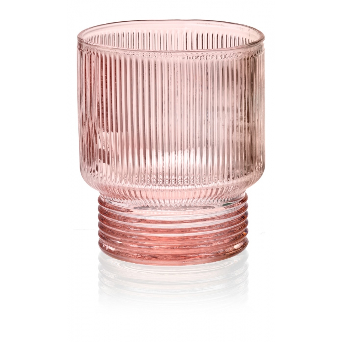 Zestaw 24 różowych szklanek wykonanych z dmuchanego szkła. Ich funkcjonalny kształt pozwala na wygodne układanie w stosy, a pionowy wzór canneté dodaje elegancji. Doskonałe do codziennego użytku, jak i na specjalne okazje.