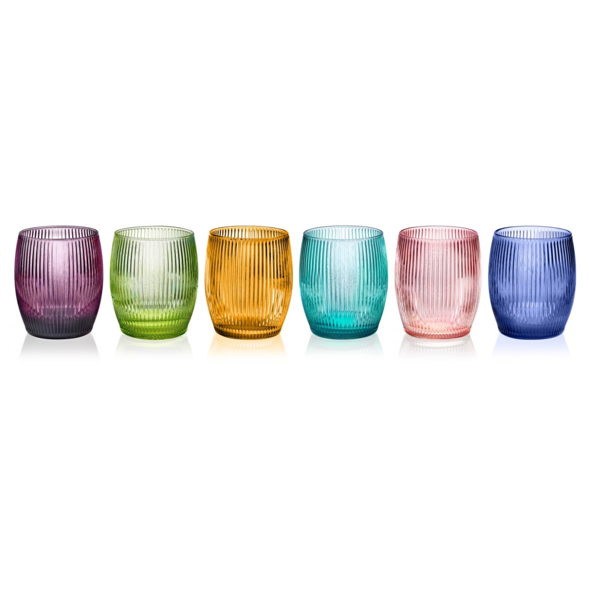 Zestaw 24 kolorowych szklanek z dmuchanego szkła. Charakterystyczny beczkowaty kształt i pionowa optyka canneté nadają im wyjątkowy wygląd, który sprawdzi się zarówno na co dzień, jak i przy bardziej eleganckich okazjach.