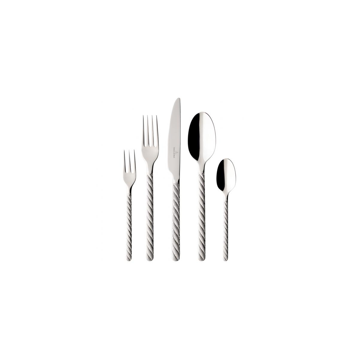Zestaw sztućców dla 6 osób - 30 częściowy. Montauk to wyjątkowa propozycja marki Villeroy & Boch. Sztućce z charakterystycznym strukturalnym wzorem liny na trzonku pasujące do kolekcji naczyń Montauk bardzo wygodnie leżą w ręce. Czy to podczas sympatycznego posiłku we dwoje, czy też miłego wieczoru w gronie przyjaciół: kolekcja Montauk codziennie roztacza atmosferę wybrzeża przy Twoim stole.