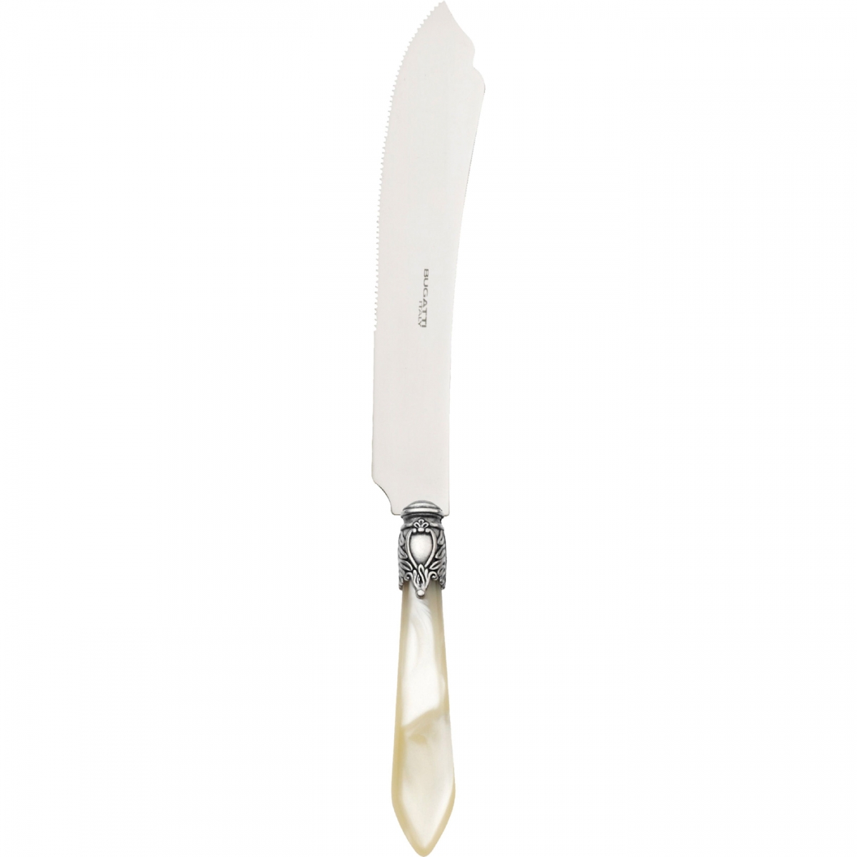 Nóż do ciasta Oxford marki Bugatti wykonany ze stali nierdzewnej, rękojeść w kolorze kości słoniowej z masy perłowej z posrebrzanym pierścieniem.
