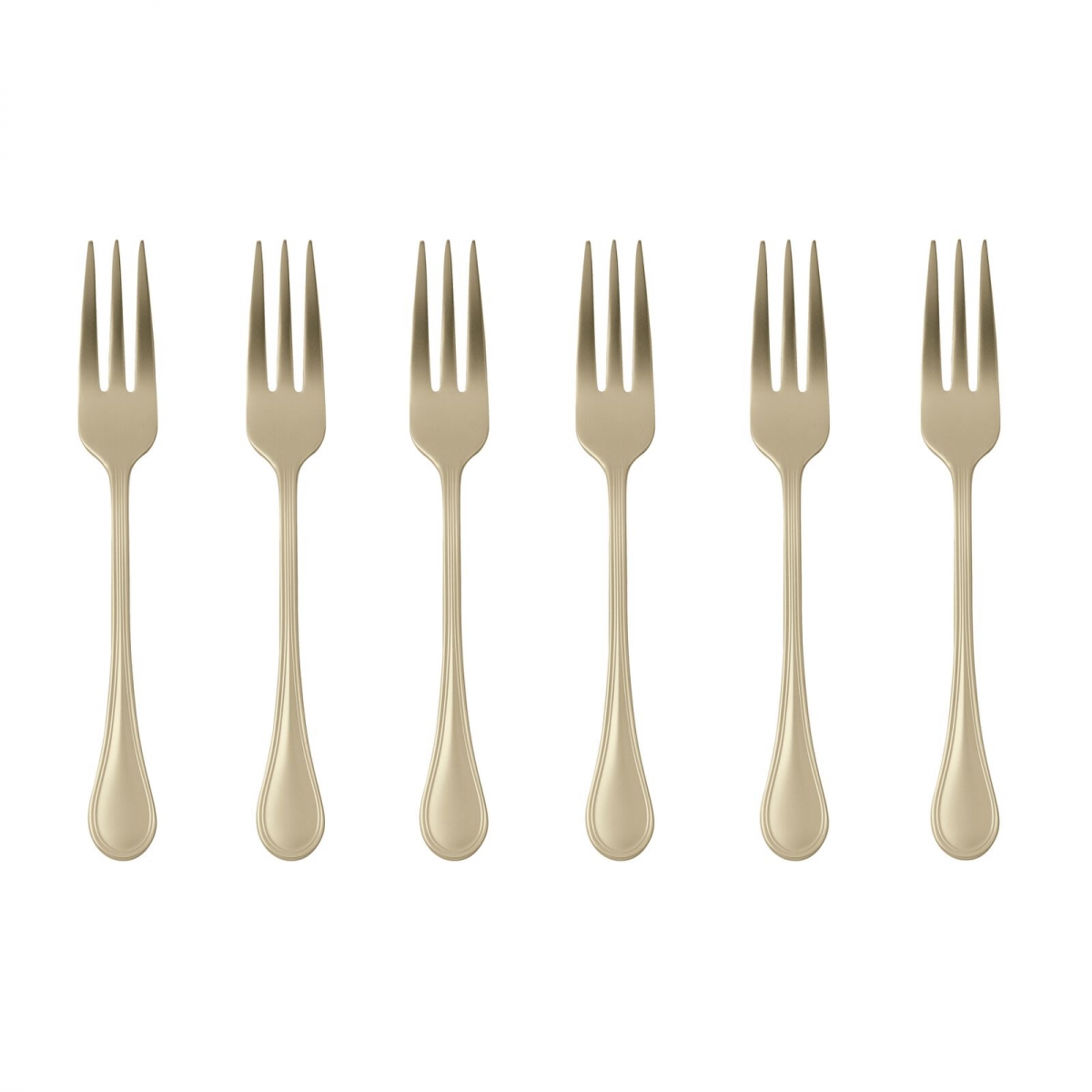 6-elementowy komplet widelczyków z kolekcji Royal Szampan Antique to wyjątkowa propozycja marki Sambonet. Sztućce łączą ergonomię i funkcjonalność, wyróżniają się dynamiczną elegancją, lecz ich wygląd jest subtelny i prosty. Piękna aranżacja stołu.