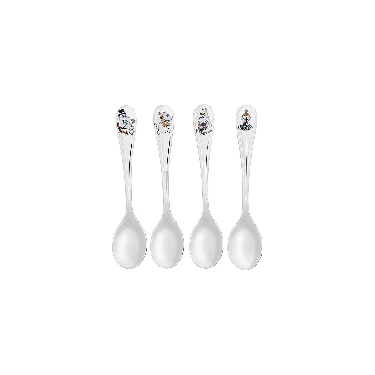 Łyżeczki dla miłośników Muminków Celebration. Komplet 4 sztuk łyżeczek do kawy, herbaty lub deserów wykonany jest ze stali szlachetniej i zapakowany w pudełko prezentowe. Łyżeczki z postaciami z książki Tove Janson - Tata Muminka, Mama Muminka, Muminek i Mała Mi.