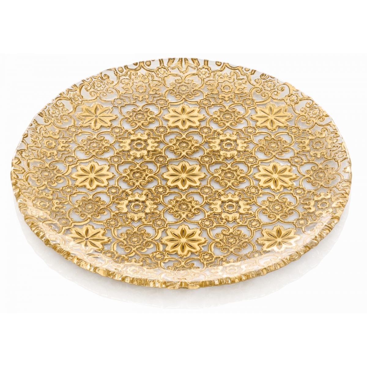 Patera ze szkła prasowanego, zdobiona na zewnątrz płatkami złota. Kolekcja Arabesque wyróżnia się subtelnym, dekoracyjnym wzorem, który jest wyraźnie wyczuwalny w dotyku i efektownie odbija światło, tworząc elegancki akcent na stole.