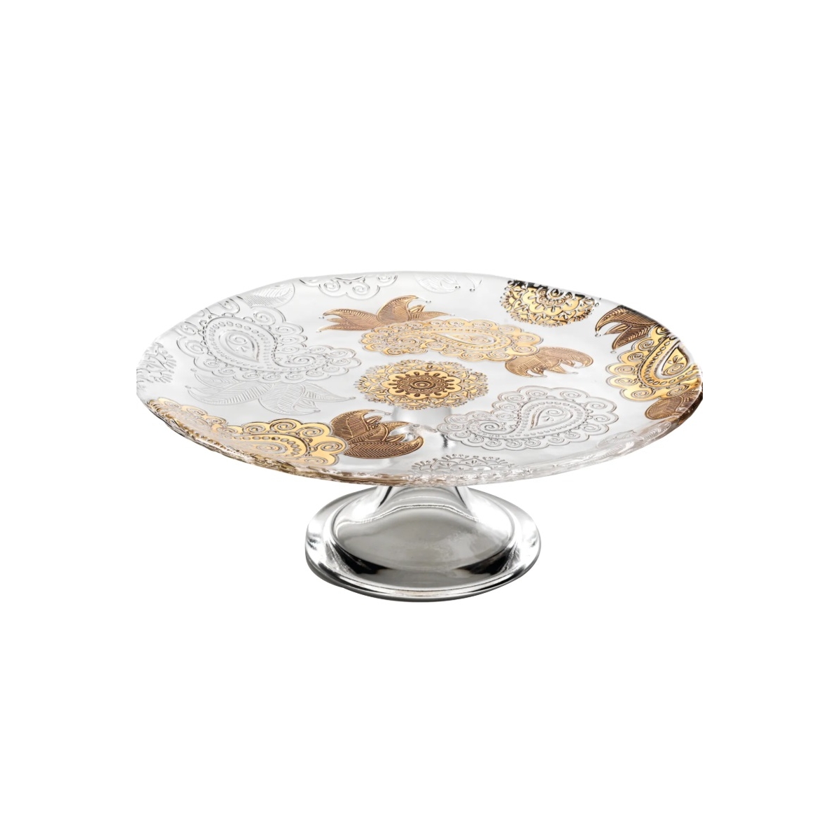 Patera na nóżce z kolekcji Pashmina wykonana ze szkła prasowanego ze złotymi zdobieniami. Wyróżnia się eleganckim, dekoracyjnym wzornictwem – idealna do wnętrz z nutą wyrafinowania.